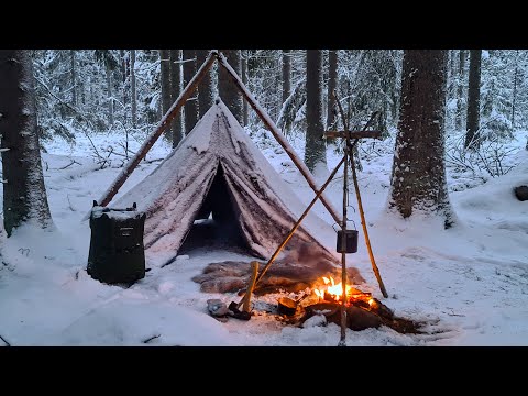 Winter Wild Camping and Hiking in Snow - Canvas Lavvu - Adjustable Bushc...